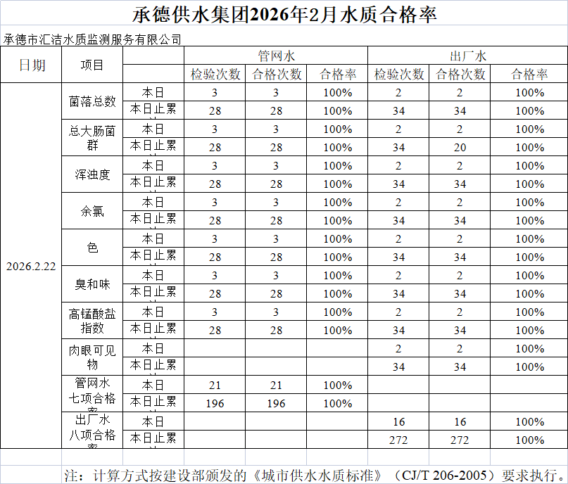 承德供水集團2026年2月22日水質(zhì)合格率